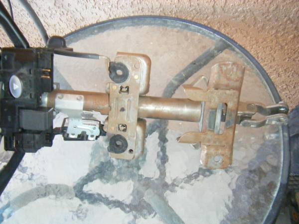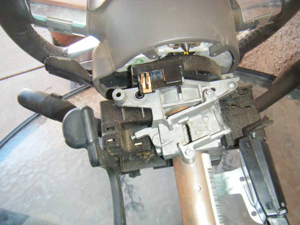 pt cruiser tilt steering column with indicator cluster , great leather wrapped steering wheel complete, needs ignition switch and housing replaced. great buy just for the leather wrapped steering...