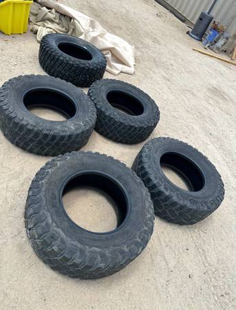 Five BF Goodrich mud terrain tires. One is a spare and never used, the other four have only 18k miles on them. Two front tires have a little less tread. Swapped out my GX to all terrains and no...