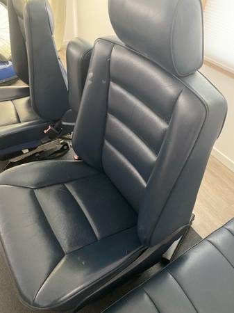 This listing is for a genuine OEM full set of power blue leather seats for a Mercedes W124 Sedan, including both front and rear seats with detachable (only front) headrests. The seats are made in Germany and feature adjustable headrests, tiltable functionality, and a cargo pocket/net. With a surface finish of blue color, these seats are designed for comfort and style in Mercedes models from 1986 to 1995. Additionally, the listing includes all the electric motors and slides, making it a complete package for upgrading your vehicle's interior.