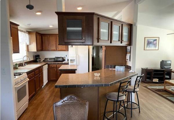 It has 1344 square feet of living space with 3 bedrooms and 2 baths. Vaulted ceilings throughout. The guest bathroom and hallway to garage with washer and dryer have tube type skylights which are great with the extra light. Beautiful large kitchen with nice wood cabinetry with a built in breakfast bar plus there is a dining area adjacent to the kitchen. Appliances include refrigerator, gas range, microwave and dishwasher. Carpeting in the bedrooms and wood laminate flooring everywhere else for easy cleaning. You are going to love the oversized 720 SF extra deep 2 garage with all the storage or work space. Total Square Footage - 2064.