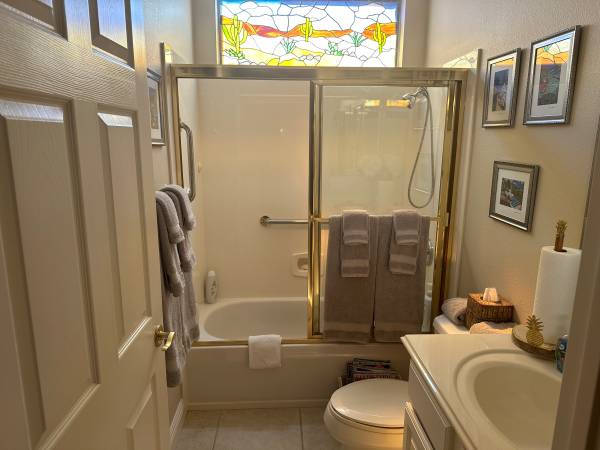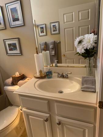 Furnished room for rent with large closet and bathroom along with sharing of home - washer, dryer, refrigerator wi-Fi, and cable. Jacuzzi in the backyard and all the amenities of the quiet 24 hour secure gated community of Sun City Palm Desert.