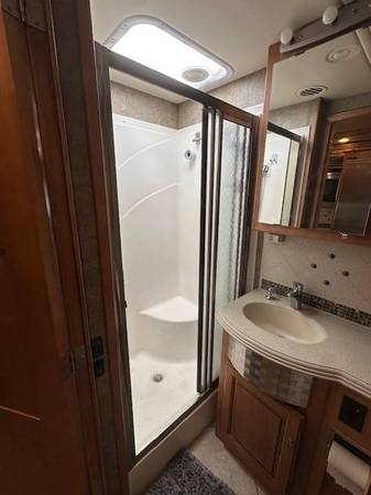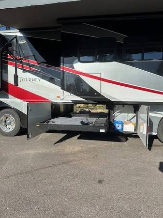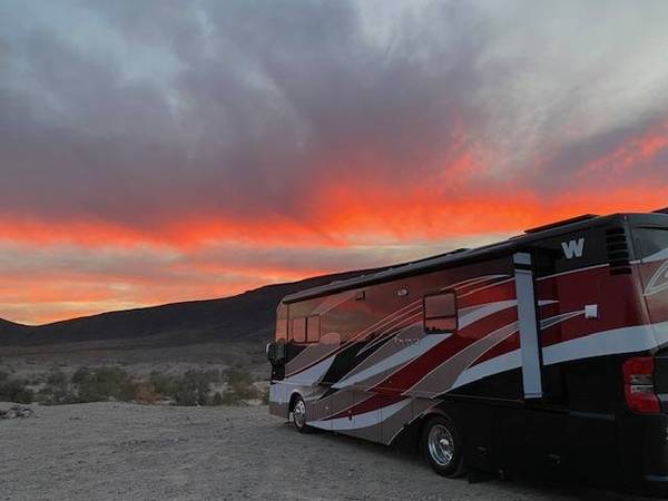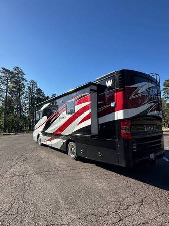 This limited edition hard to find color combo is an attention grabber and attracts a crowd wherever we goyoull be hard pressed to find a more impressive looking rig! Coach features a professionally installed 915 watt solar system with a MASSIVE Renogy battery bank for the ultimate offgrid experience, upgraded leather power recliners and the King Bed option with a super comfy 8 Mattress Insider Park Meadow. Previous owners installed a Banks Power system which I dont use, I leave it in stock mode but its there if you want it. All lighting has been upgraded to LED. Added a Bluetooth and Wifi EasyTouch thermostat that wirelessly runs both front and rear ACs, both front and rear heat pumps and both front and rear furnaces total game changer!