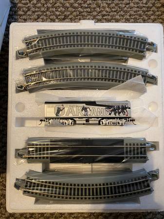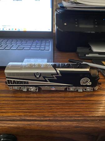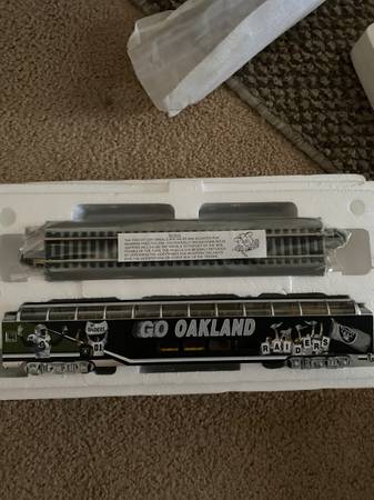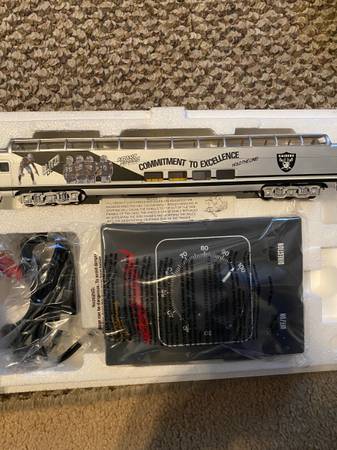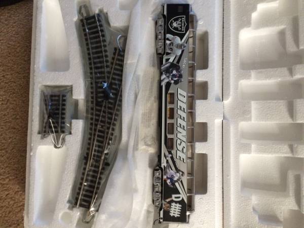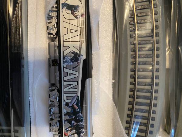 NEW OAKLAND RAIDERS TRAIN SET. COMPLETE WITH TRACKS, NEVER USED. HAS LOCOMOTIVE ENGINE, OFFENSIVE POWER DOME CAR, FAN DOME CAR, DEFENSIVE DOME CAR, COMMITMENT TO EXCELLENCE DOME CAR CHAMPIONS BOX CAR & OAKLAND OFFENSIVE ENGINE. EACH PIECE HAS ITS Authenticity paperwork. I was going to hang the track in the family room ceiling but never did it. HAWTHORNE VILLAGE COLLECTABLES FOR THE TRUE RAIDER FAN THAT HAS IT ALL, EXCEPT THIS !! BE THE ENVY OF YOUR FRIENDS!! call show contact info