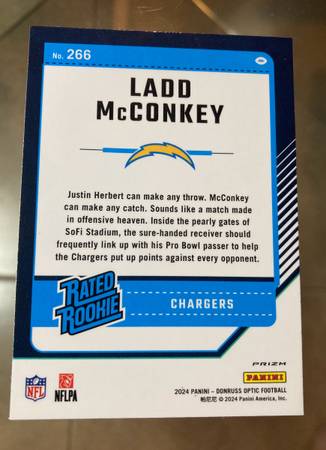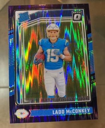 2024 Panini Donruss Optic Ladd McConkey Rated Rookie #266 Purple Shock Prizm SP could be a PSA 9 or 10 . Waiting to be graded ! Beautiful card. NFL Chargers .