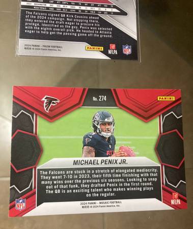 2024 Panini Prizm Rookies Red White & Blue Holo Michael Penix Jr #378 Rookie RC great condition, plus 2024 Mosaic NFL Debut RC #274 good condition. You get both cards