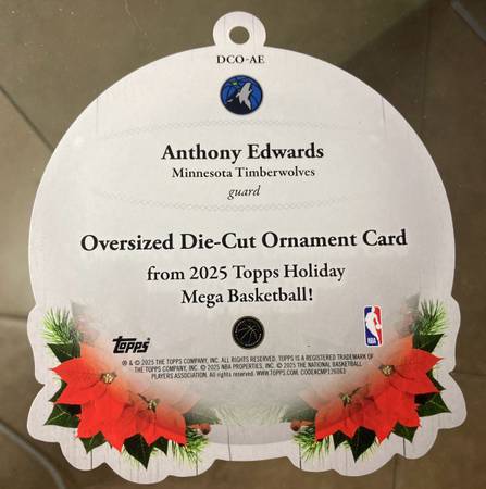 2025 Topps NBA Holiday Oversized Die-cut Ornament Anthony Edwards DCO-AE. Great mint condition . Right out of the box .