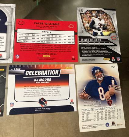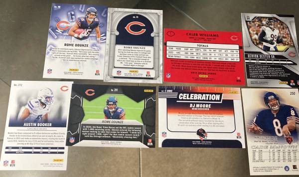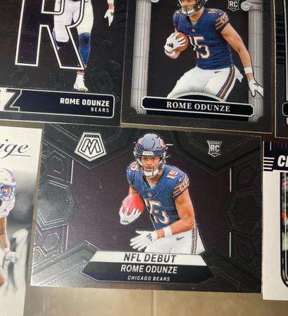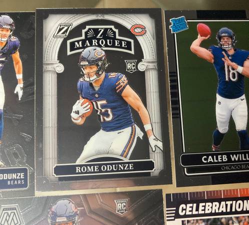 8 card Chicago Bears RC lot Caleb Williams Rome Odunze Optic Mosaic etc , 3 Rome Odunze rookies . 1 2024 Optic Caleb Williams. DJ Moore Cade McNown etc cards are in good condition.