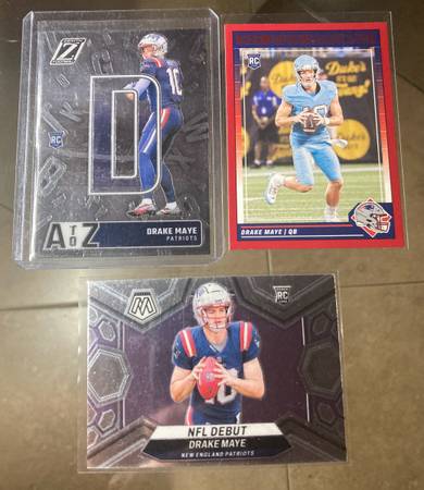 3 card Drake Maye Patriots Rookie card lot Mosaic Score red etc. 2024 Mosaic NFL Debut , 2024 Score red parallel. 2024 Zenith A to Z.good condition .resdy for grading . PSA 10?