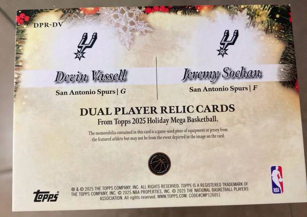 2025-2026 Topps Holiday Devin Vassell & Jeremy Sochan Dual Player Game Used Card. Jersey relic . Straight from pack to sleeve