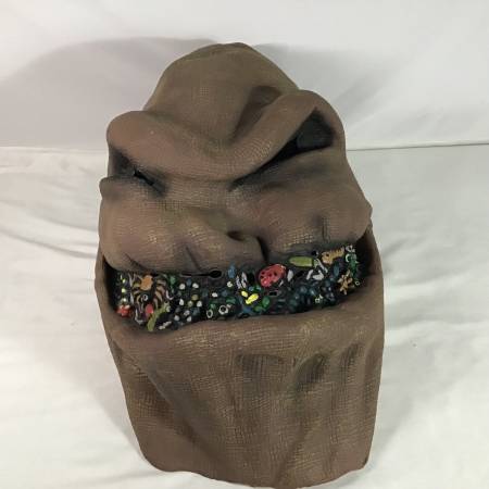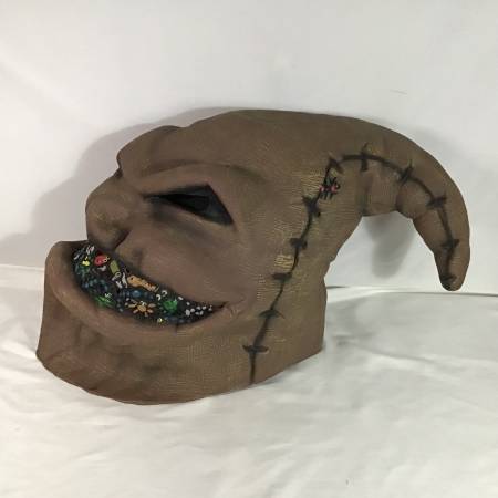 Halloween Disney Nightmare Before Christmas Oogie Boogie mask! This overhead mask is made of durable plastic and features a multi-color design with the iconic Oogie Boogie character. Perfect for adult unisex wearers, this mask is great for any Halloween occasion.