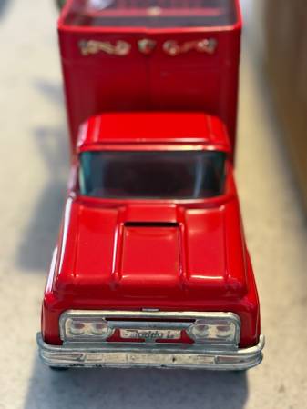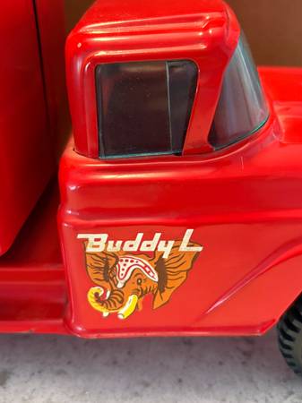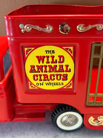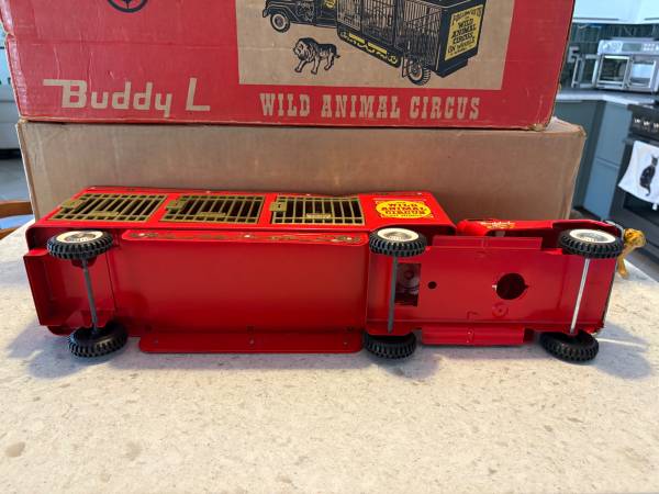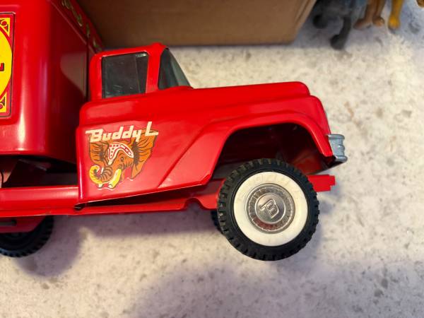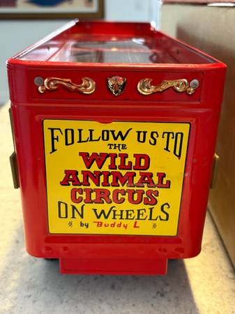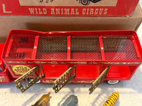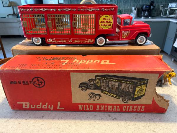 Vintage Buddy L Wild Animal Circus Truck. It comes with all 3 animals (tiger, lion and elephant). The box is worn and missing one end. The labels are in excellent condition but the rear one is missing a tiny bit. The elephant is missing one ear. The main flaw is that one of the sides of the truck is bent probably from being dropped in the box.