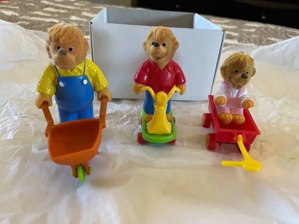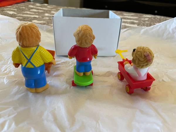 The Vintage 1980's Berenstain Bears McDonald's Happy Meal Toys are collectible toys that were distributed through McDonald's during the 1980s. These toys feature characters from the popular Berenstain Bears cartoon series and were included as part of McDonald's Happy Meal promotions. Perfect for fans of the Berenstain Bears or collectors of vintage fast food toys, these nostalgic items serve as a reminder of the popular culture from the 1980s. Characters are Papa Bear, Brother Bear and Sister Bear.