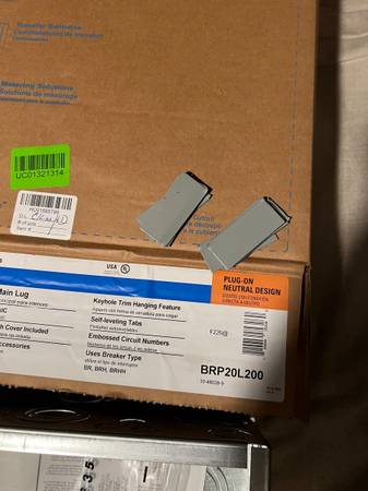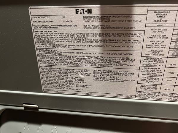 New except breaker tabs removed from front cover… Back assembly completely untouched/new. Cutler Hammer/Eaton 200 amp 20/40, no main breaker in panel. $440 at Platt I have 120v & 240v breakers...