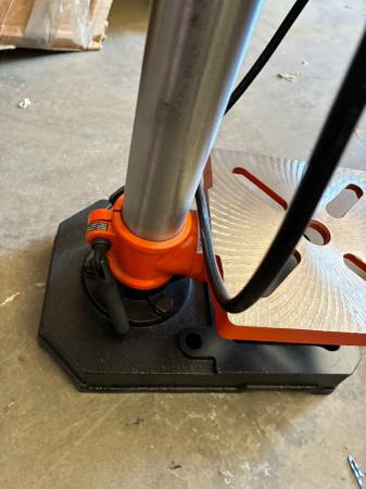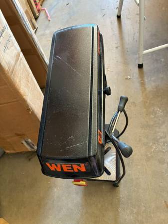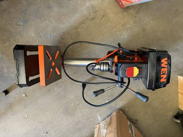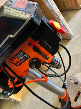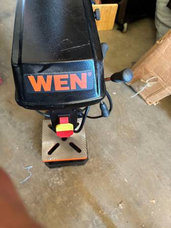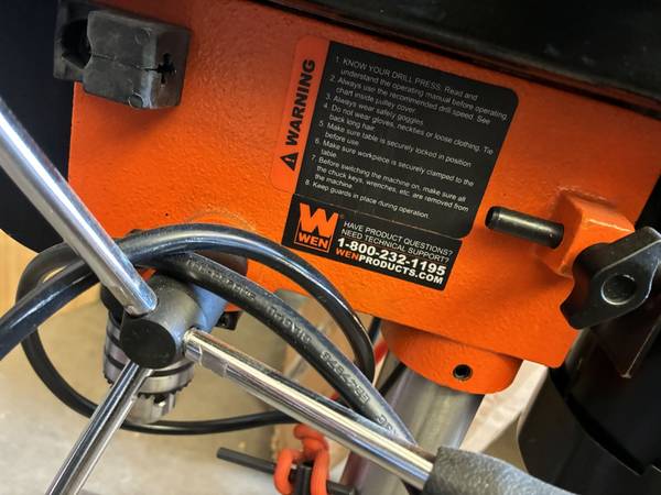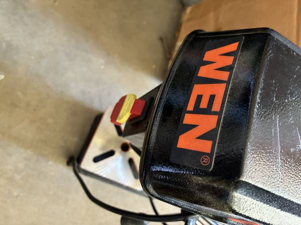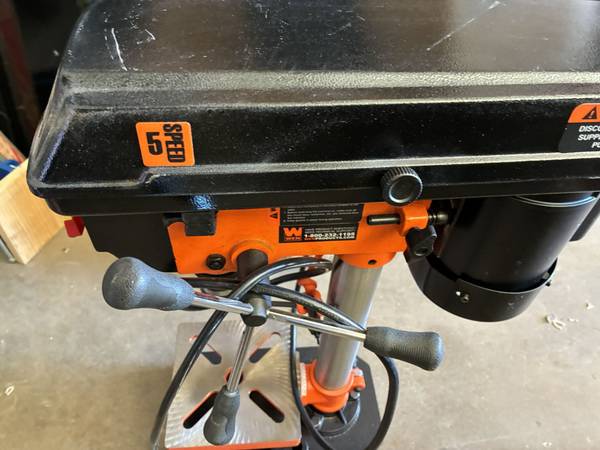 WEN 8-inch 5-Speed Benchtop Drill Press, model 4208T or 4206T. It features a 2.3-amp induction motor and a 1/2-inch keyed chuck. The drill press has an 8-inch swing and a 2-inch spindle travel. It operates at five different speeds, which can be adjusted by changing the belt position on the spindles. The worktable is adjustable and can bevel up to 45 degrees in both directions.