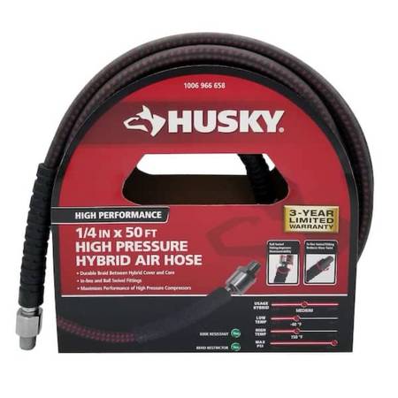 Introducing the Husky 600 psi high pressure air hose that can be used with all high pressure compressors and tools found in the market. The tightly wound internal braids hold up to the increased air pressure, but the hybrid cover and core allow it to remain flexible. Those same cover and core allow this hose to be highly flexible in extreme cold temperatures. Equipped with 2 different swivel fittings to maximize maneuverability and ease of use. The high-end nylon spiral bend restrictors offer true protection and extend hose life.