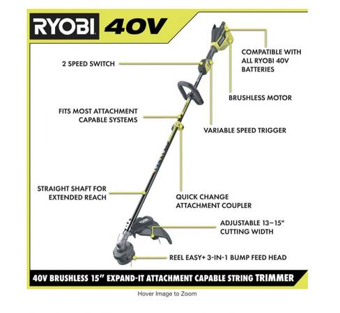 RYOBI 40V Brushless Cordless Battery Attachment Capable String Trimmer with 4.0 Ah Battery and Charger Brand new. 4 available. Retails for $200 at Home Depot. Model #RY40270 Delivery available if...