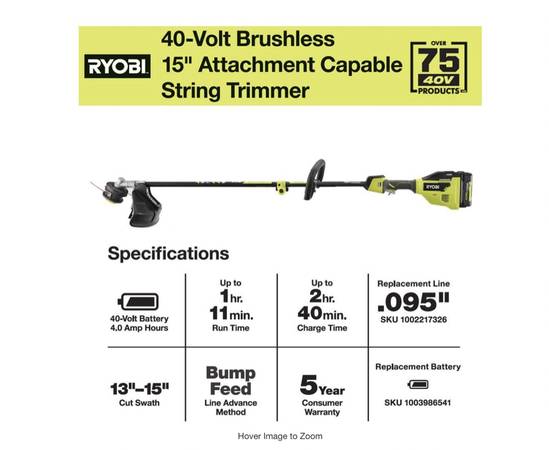 RYOBI 40V Brushless Battery Attachment Capable String Trimmer KIT -...
