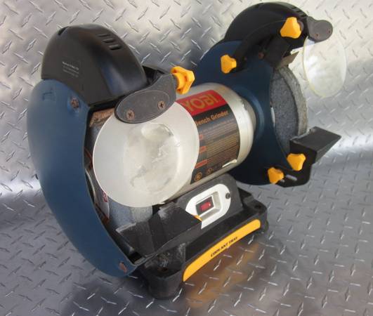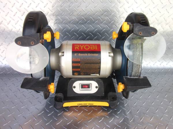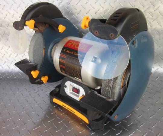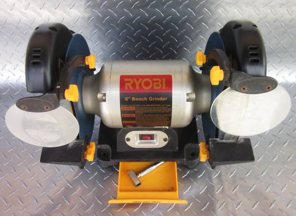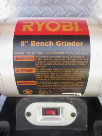 Offering a used bench grinder by Ryobi, model BGH827. 3 Amp Motor, for 8"wheels, lights on each wheel cover.
