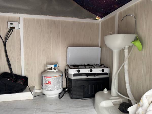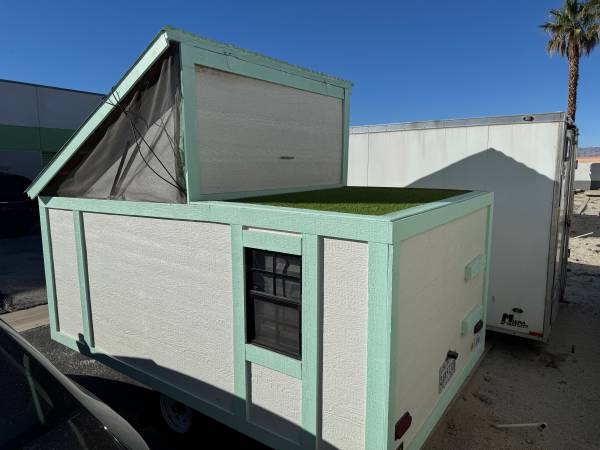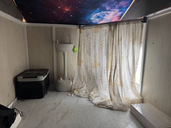 60 sq feet of living space, pop top, powered cooler/fridge, working sink/toilet, fully functional stove with propane tank included. The entire camper is off grid ready and completely solar powered....