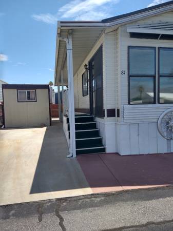 Park Model Mobile Home in desirable Rainbow Spa, a senior Recreational Vehicle park in Desert Hot Springs. This trailer is perfect for a single person or couple. Comes turn-key ready with everything that you need. Just pack your clothes and stop at the grocery store. Includes one parking space, a large storage shed, and a small fenced-in back yard.