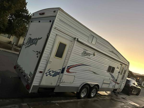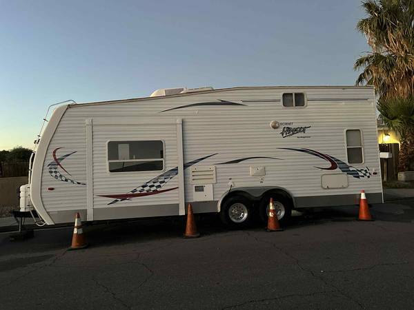 The 2006 Keystone Hornet Hideout 27FLSH is a travel trailer and toy hauler that is approximately 27-28 feet long and can sleep up to 5-7 people, depending on the specific features. Key features include a private bedroom with a queen bed, a convertible dinette and sofa for extra sleeping, a full kitchen with a three-burner range and a refrigerator, and a private bathroom with a tub/shower combo. As a toy hauler, it features a garage area with a diamond plate floor for storing powersports equipment.
