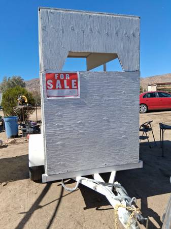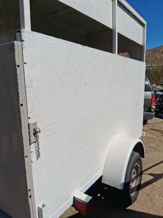 Excellent Utility, or food or small livestock trailer. Awesome combination convertible gate ( swings open to the left) and folds down as a heavy duty ramp. Very easy to switch anytime as needed. Trailer is Very well built. Front, back, sides and floor is steel framed plywoood. New registration, chains, wiring and lights. Lights are steel frame protected. Convenient folding swing jack.Walls and roof are very convenient at 6 feet tall! Makes for convenient loading or servin items from inside. 4'x8' Deck with 3' of tongue. Suitable size for ponies (no divider or feeder) or small to medium farm animals. Great for K9, sleep in, or covered food truck. Aluminum 5 lug, 14 " mag rims with new tires (older but garage kept). Water sealed and painted. This is a sturdy and well built trailer so please don't low ball. New 5 yr DMV registration and plates. Open to possible partial trade for Large generator 50 amp 12,000 watts.Morongo Valley.