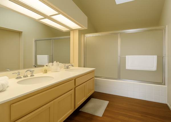 - The primary suite is spacious and its sliding glass doors lead to a patio with golf-course, pond, and mountain views. The master bath area features access to a generously sized walk-in closet. The guest bedroom is located on the opposing side of the condo, with an adjacent bathroom, toilet and shower.
