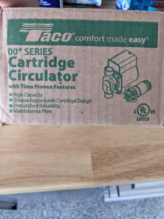Free Free Free, but read this whole paragraph - Taco Circulator for water heater to create quicker hot water at home facets. Process described on Taco website. Requires lots of plumbing connections. I believe it needs a new cartridge which costs $220 +tax. Taco 006-ST4 1/40 hp 115 volt stainless steel. This does not include the timer module which shows in the picture of my installation. A new complete, working Taco 006-ST4 costs $400. A new cartridge, (Cartridge Assembly Complete: 005-020RP), costs around $220 +tax. Do the research to make sure you can use it.